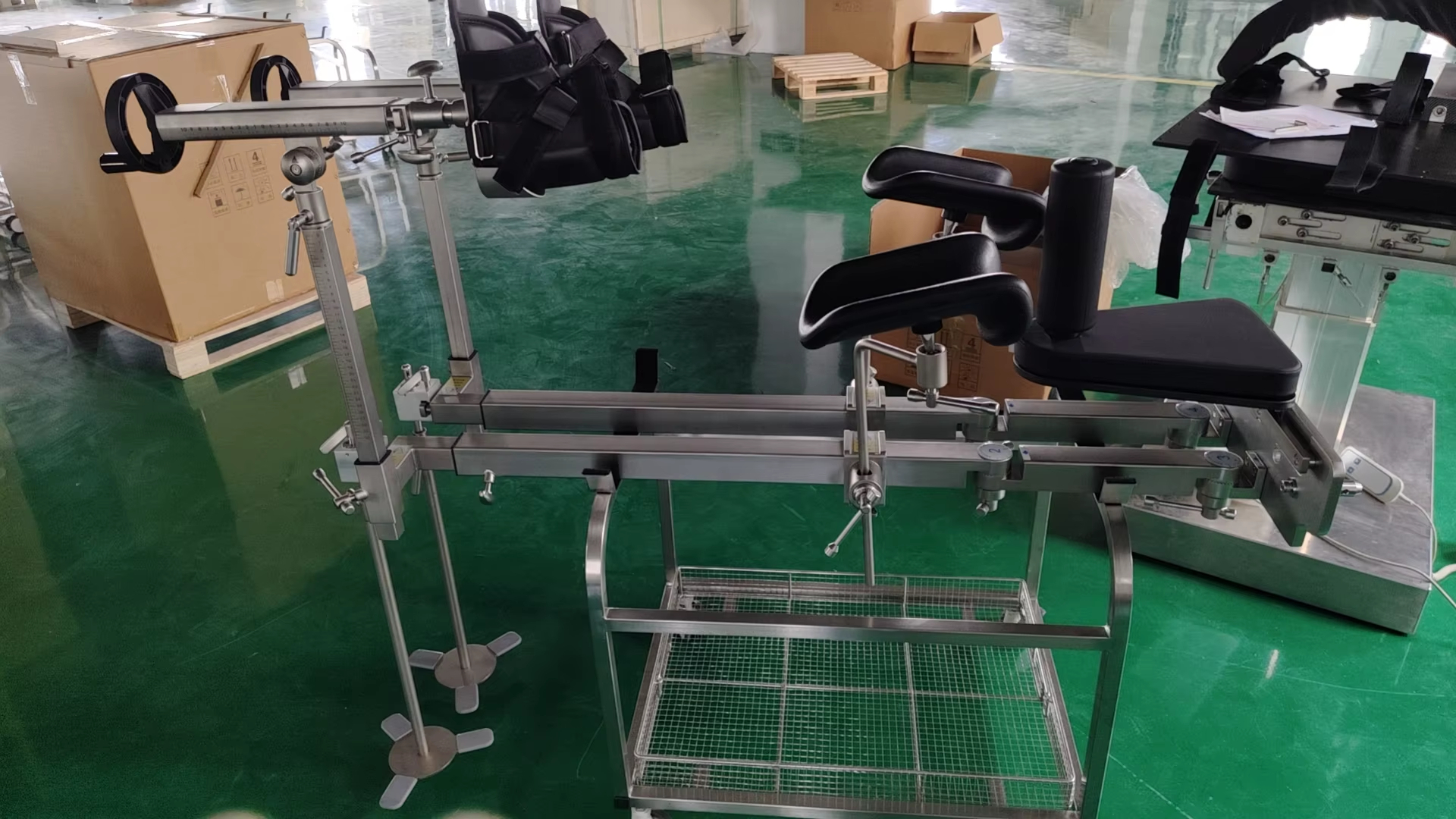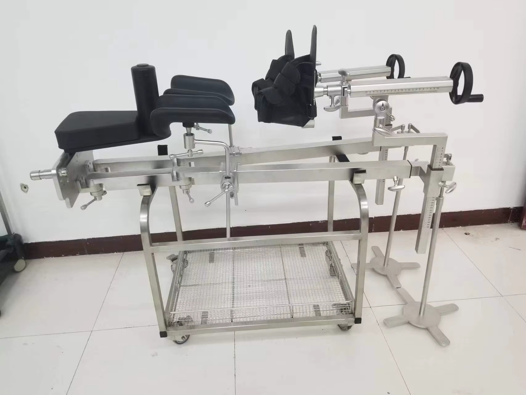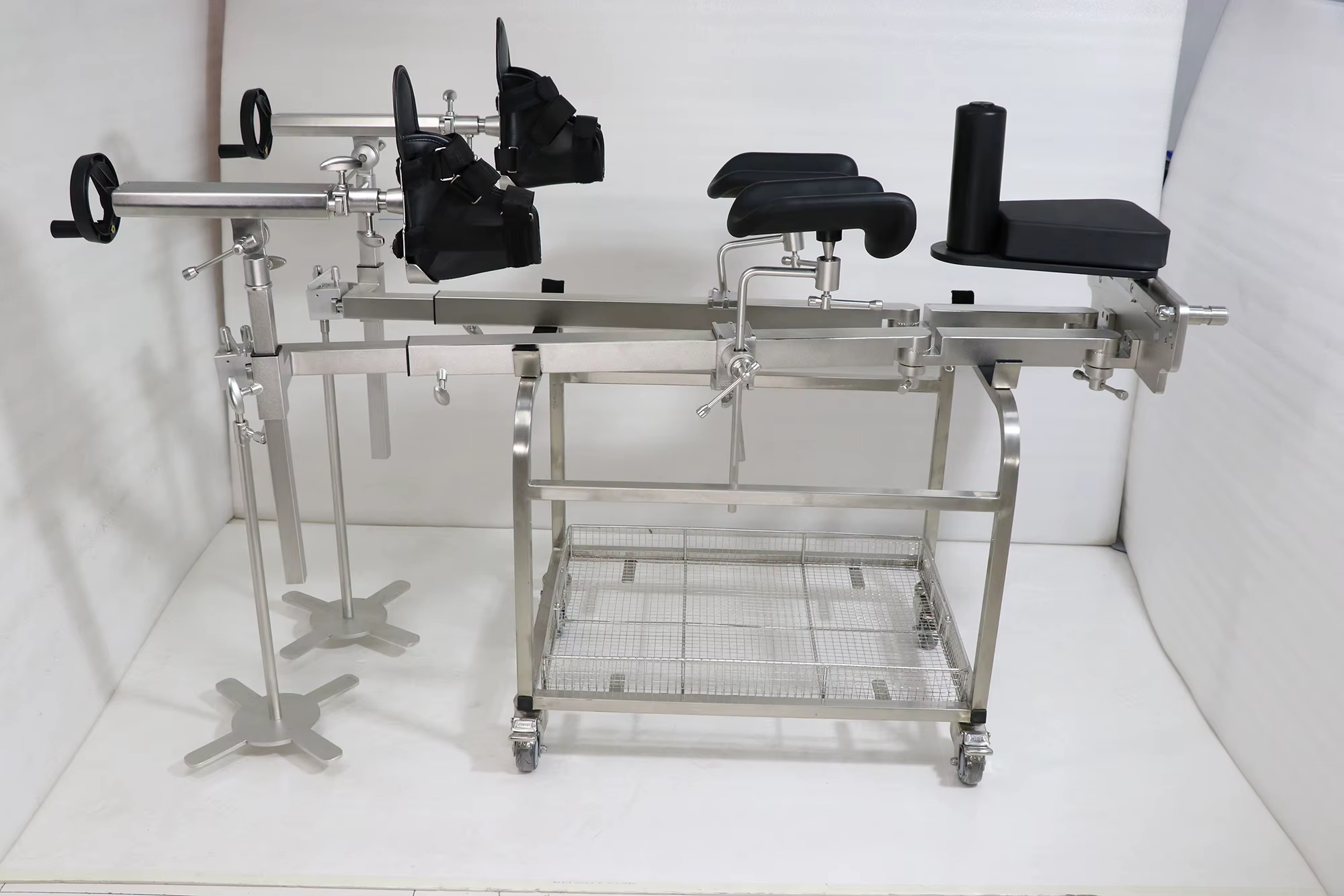 YGG02 Sine ferro orthopaedica Tractio Frame specialiter destinatur chirurgiae orthopaedicae et maxime adhibetur ad tractionem membri inferioris in conjunctione cum mensa operante. Factus est summus roboris 304 ferro immaculatus, habet optimam corrosionem resistendi et oxidationis resistentiam, diuturnum et stabilem usum instrumentorum procurans. Angulus commensurationis partem tractionis compagis adhibet processus densis dentem finem, ut angulus accurate defigatur et non solvatur. Duplex consilium iuncturae et extensio retractabilis virga permittit tractus artus libere componi in multiplicibus angulis, tractandi methodum flexibilem praebens, late chirurgicam prospectui, et levem chirurgicum. Artus tractus aptabilitatem validam habet, facile ad operandum, cito inaugurari potest et adaequari, et compatitur cum variis tabulis operantibus. In fractura correctionis, in reposito iuncturae, et in aliis surgeriis late adhibetur